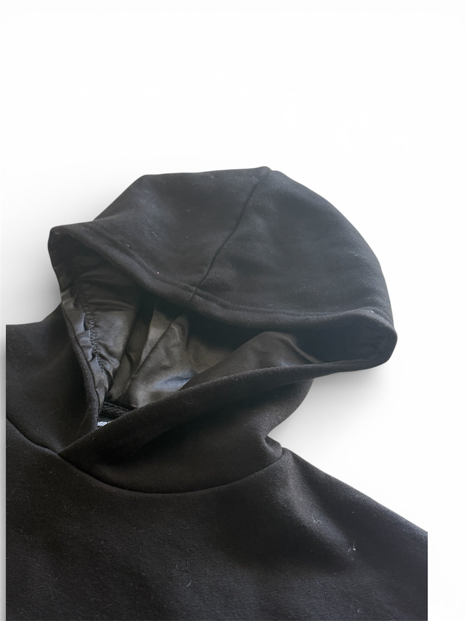 Black Unmatched Hoodie- Puff Print & Silk Hood